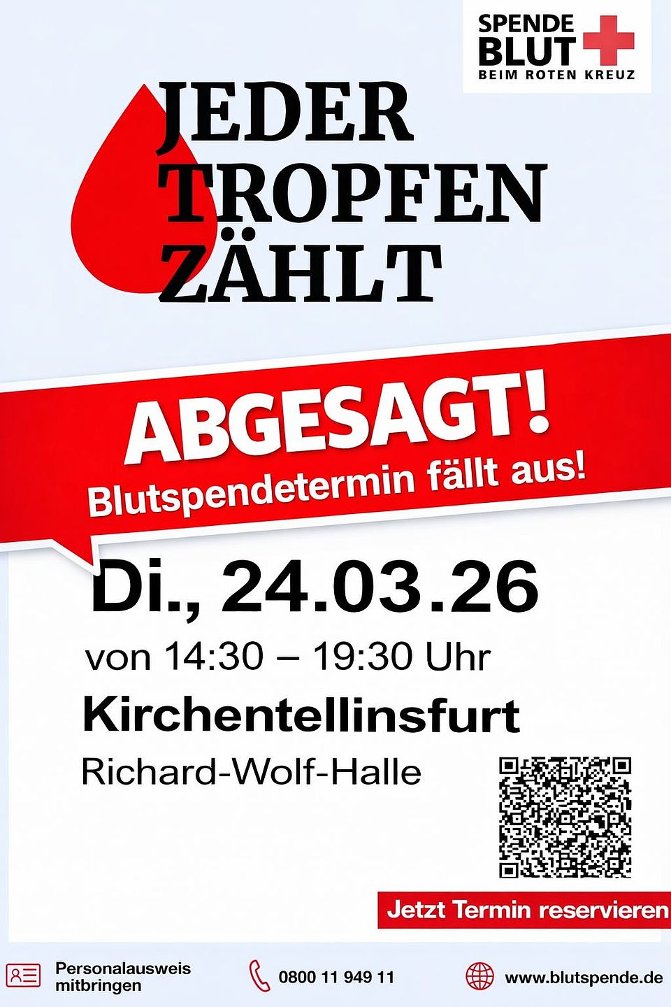 Leider müssen wir euch mitteilen, dass der geplante Blutspendetermin für heute den, 24.03.2026 in Kirchentellinsfurt kurzfristig abgesagt wurde.
